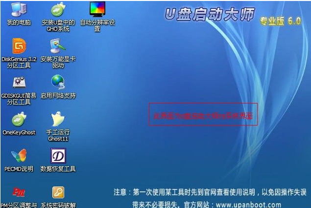 怎么用OneKey Ghost安裝系統(tǒng)1、請(qǐng)認(rèn)準(zhǔn)U盤(pán)啟動(dòng)大師PE系統(tǒng)界面如下圖: