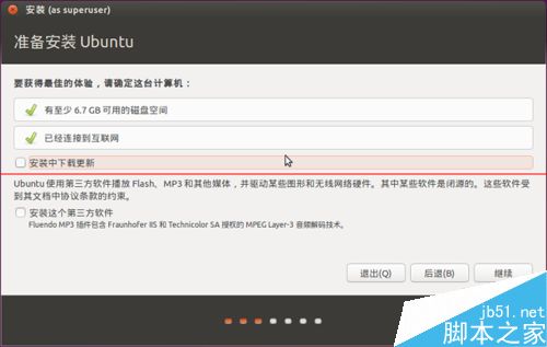 主要是磁盤空間要夠用?;ヂ?lián)網(wǎng)連接可有可無(wú),“安裝中下載更新”和“安裝這個(gè)第三方軟件”可以不選,都可以在安裝后進(jìn)行的。