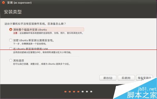 在虛擬機(jī)中安裝,我們選“清除整個(gè)磁盤并安裝 Ubuntu”。如果是在實(shí)體機(jī)上安裝,并且想與原來(lái)的 Windows 等操作系統(tǒng)形成雙系統(tǒng)雙啟動(dòng),則可以選擇“其他選項(xiàng)”,里面有豐富的選項(xiàng)設(shè)置。