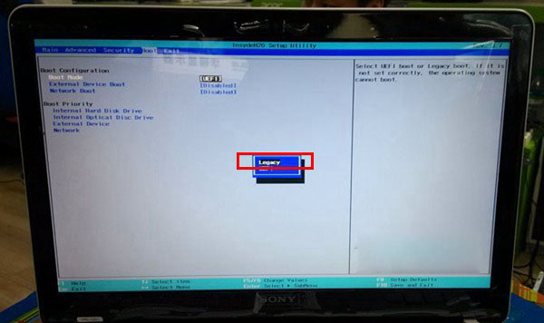五,再接下來,在鍵盤上面用左右方向鍵切換至Boot欄,找到Boot mode項,把UEFl改成Legacy,如所圖所示: