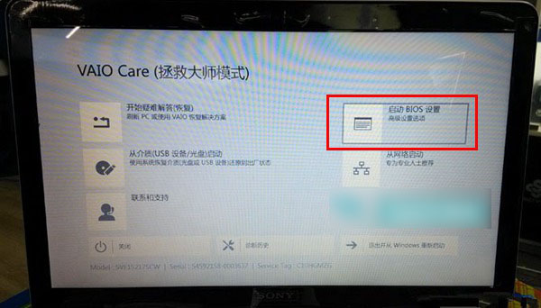 二,按了之后,筆記本就會顯示出VAIO Care(拯救大師模式)界面,然后在該界面選擇進入【BIOS設置】,如下圖所示: