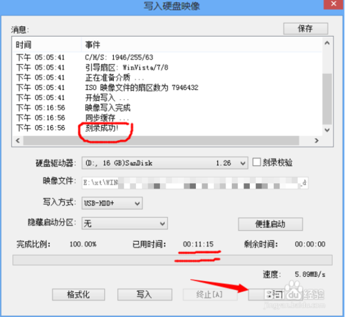 3、單擊【啟動(dòng)】--“寫入硬盤映像--可以看到U盤、映像文件都被自動(dòng)識(shí)別,那就直接單擊“寫入”吧!圖2是寫入過(guò)程,大約經(jīng)歷11分鐘。最后,返回即可。