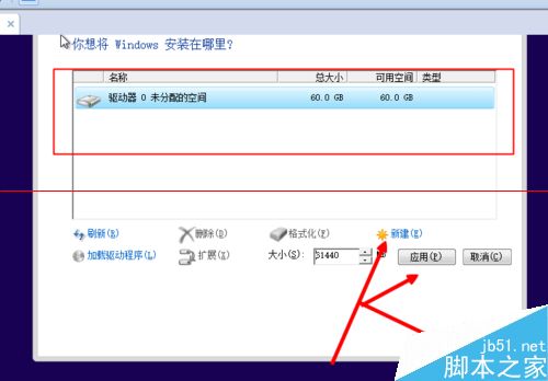 16、這個是我們60g硬盤,我們選中硬盤,先新建-應用-在點擊下一步