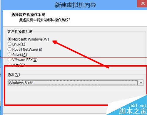 5、上邊選擇客戶機為windows,您要是想安裝w10--64位選擇windos 8 x64,因為VMware Workstation還沒出w10的安裝選項,我們選擇w8就行,我測試成功了