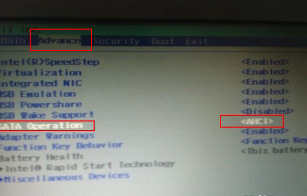 第二步:按ESC返回BIOS操作界面,找到Advance標簽,選擇“SATA Operation”選項,將硬盤模式切換到AHCI模式,按ESC,選擇SAVE保存退出。