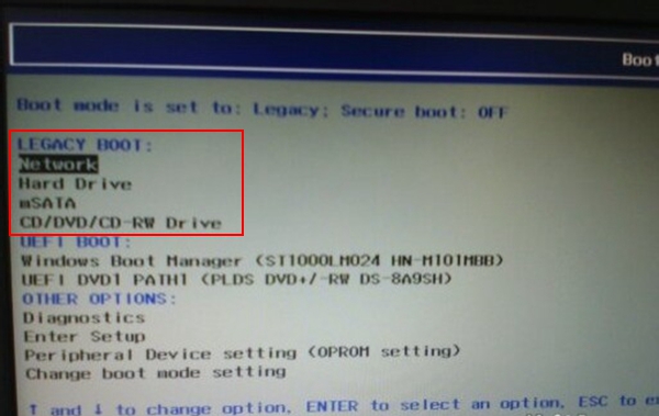 第三步:返回到BOOT界面,選擇啟動方式,如果是光盤安裝系統,就在LEGACY BOOT下,將CD/DVD/CD_CR Drive調到第一個。按F10鍵保存退出。