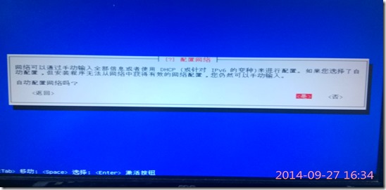 使用系統的自動網絡配置選項。(這一步是系統自動配置網絡,直接選擇是就行了,系統安裝完成之后可以通過手動的方式修改為靜態ip地址。)