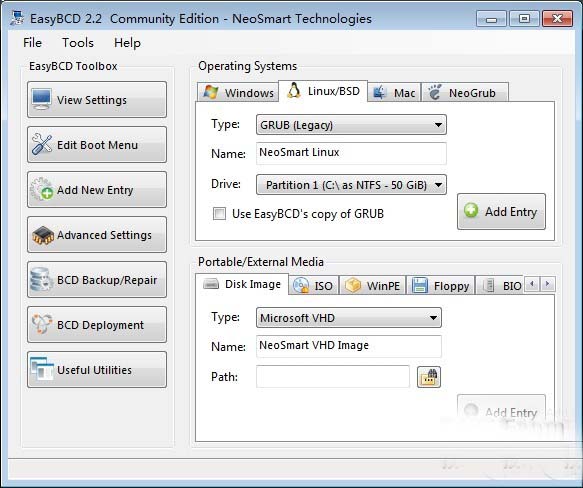 6.裝好系統后,重啟,選擇進入Win7,打開easyBCD,"Add New Entry"--"Linux/BSD"--"Add Entry",
