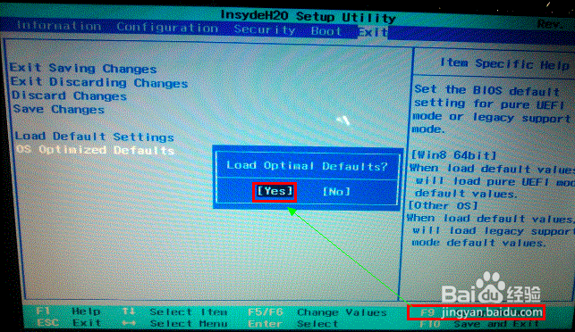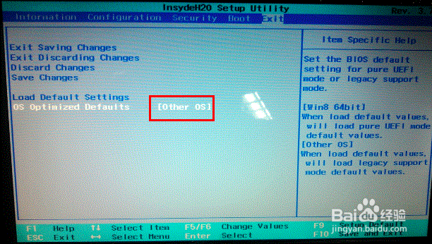 Y,U,Z,S,G系列機型:如Y400、Y500、Y480、Y580、S206、S300、S400、S405、Z380、Z480、Z485、U310、U410、U510、G480、G580、G780、G485、P580、N580等1. 按【F2】進入BIOS,部分機型需要按【FN】+【F2】進入BIOS,選擇【EXIT】-【OS Optimized Defaults】將【win 8 64 BIT】選擇為【Other OS】.如下圖: