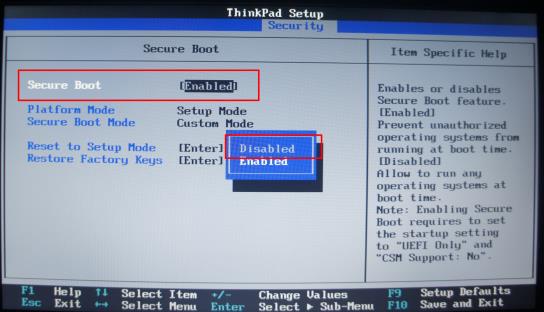 1. 在Security標(biāo)簽下找到Secure Boot選項(xiàng),回車進(jìn)入,把第一項(xiàng)Secure Boot從“Enabled”切換為“Disabled”;