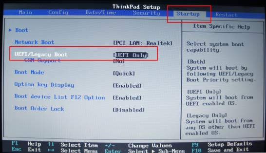 2. 按ESC鍵回退到主界面,在Startup標(biāo)簽下找到UEFI/Legacy Boot選項(xiàng),把默認(rèn)狀態(tài)UEFI Only改成Legacy Only;