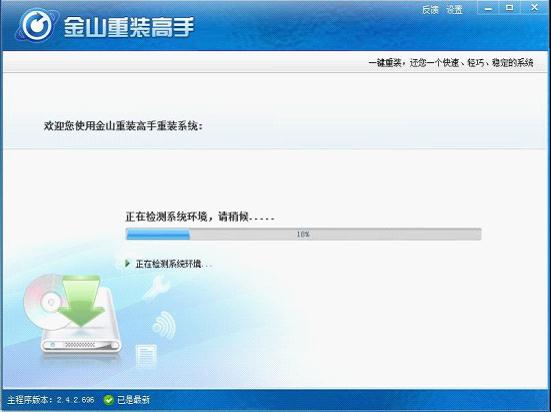安裝完打開金山重裝高手,革命性一鍵裝機工具,該工具讓您無需系統(tǒng)光盤,無需重復打補丁,一鍵重裝系統(tǒng),并且自動備份/還原數(shù)據(jù),永不丟失。