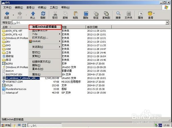 5.進(jìn)入WINPE后,找到剛才準(zhǔn)備好的原版WIN7鏡像文件,利用ImDisk將其加載成虛擬磁盤,如圖: