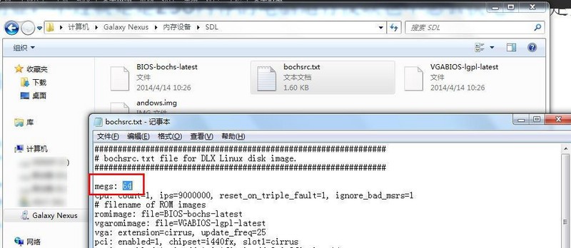 之后,將SDL文件夾內的 bochsrc.txt文件打開,找到“megs:64”,這個代表虛擬機的運行內存,我們需要將其設置為我們手機內存的一半,如果你的手機是1G內存,那么這里就改成512即可。你的手機內存越大,XP系統在你手機上運行的速度就越快!