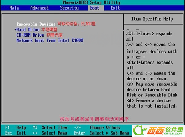 接下來重啟電腦,在開機的第一屏,按F2進入BIOS(某些機型可能不一樣,具體參見BIOS上下左右的提示字符),然后找到啟動項,調整U盤位第一啟動(很多主板上會用Removable Device可移動設備來代表)。
