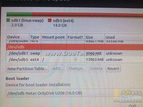 安裝注意項:在安裝的時候像正常在硬盤上安裝 Ubntu 一樣,從光盤或 USB Live 盤引導安裝程序,當然 U 盤也要插在機器上。關鍵在于分區的時候要使用手動分區,然后在 Boot Loader 上選擇安裝到 U 盤,具體見下面的圖。