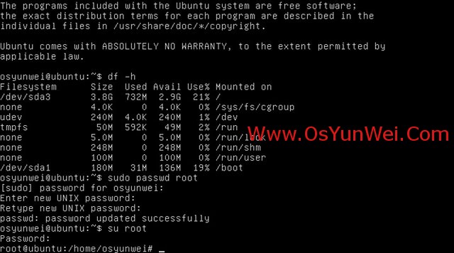 sudo passwd -l root #禁用root賬號(hào),如果要啟用,輸入sudo passwd root再次設(shè)置root密碼