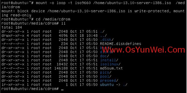 #把系統(tǒng)鏡像文件/home/ubuntu-13.10-server-i386.iso掛載到/media/cdrom目錄下