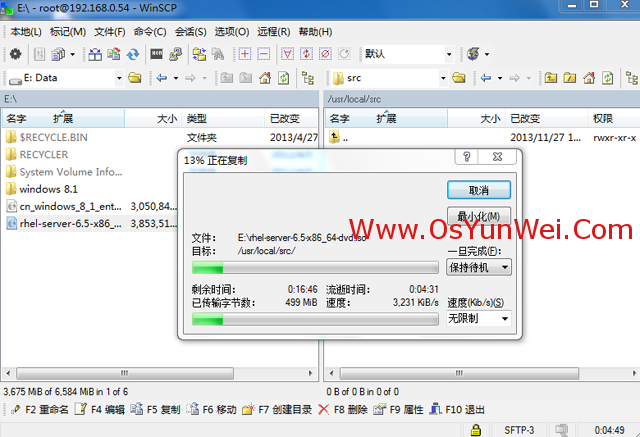 1、使用WinSCP.exe工具上傳系統鏡像文件rhel-server-6.5-x86_64-dvd.iso到/usr/local/src目錄