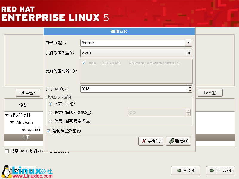 使用相同的方法依次建立“/home”,大小為2048M。