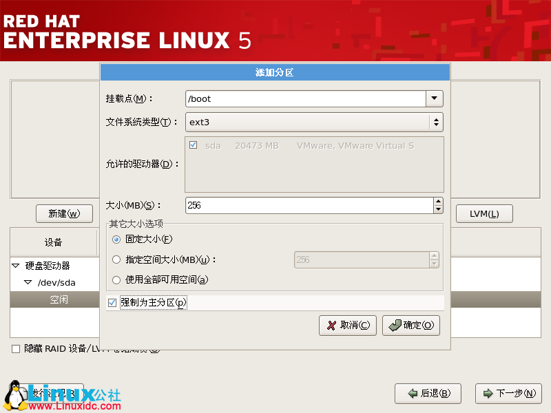 在“掛載點(diǎn)”選擇“boot”分區(qū),在“文件系統(tǒng)”中選擇“ext3”,“大小”處輸入分區(qū)大小,這里輸入256M