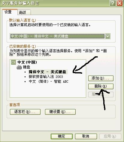 在彈出的下面窗口中,按箭頭的指示,選中你不要的輸入法,點刪除!當你想要的時候,當然也可以從添加加進來!