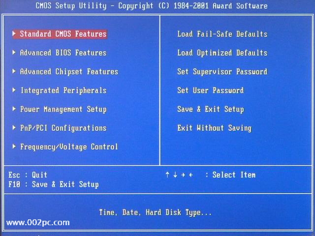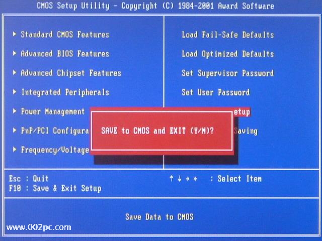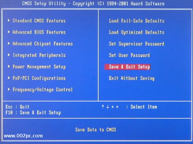 (上圖中Floppy--軟盤、HDD-0--硬盤、CDROM--光盤)然后按“向上或向下”箭頭鍵,選擇 “Floppy”項(xiàng),接著按“Enter”回車鍵,即完成該項(xiàng)設(shè)置并重新返回了圖4畫面,你可以看到該項(xiàng)設(shè)置已經(jīng)改變了。用同樣的方法設(shè)置“Second Boot Device”項(xiàng)為“HDD-0”。設(shè)置完成后按“Esc”鍵退出到(圖1)畫面,然后按“向右、向下”鍵選“Save & Exit Setup”項(xiàng),該項(xiàng)意思(保存設(shè)置并退出),如下圖6(www.002pc.com)