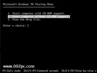 第一項(xiàng)“1. Start Windows 98 Setup from CD-ROM”(從光盤啟動(dòng)安裝Windows 98系統(tǒng)) 第二項(xiàng)“2. Start computer without CD-ROM support”(加載光驅(qū)驅(qū)動(dòng)程序進(jìn)入DOS) 第三項(xiàng)“3. Start computer without CD-ROM support”(不加載光驅(qū)驅(qū)動(dòng)程序進(jìn)入DOS)