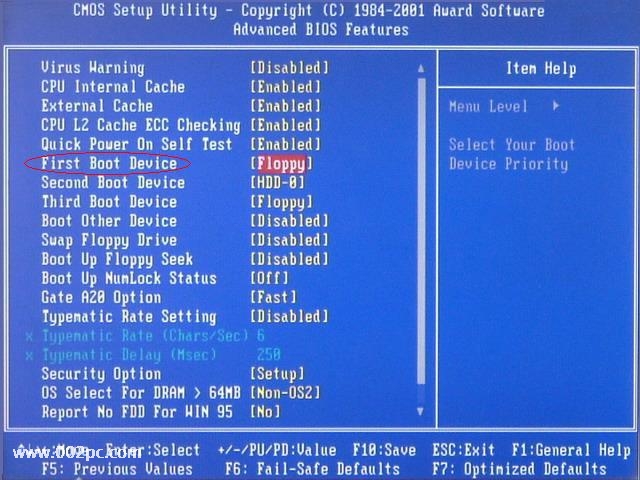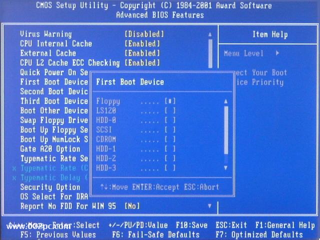 這里的“First Boot Device”項(xiàng)為設(shè)置第一啟動(dòng)盤項(xiàng),“Second Boot Device”項(xiàng)為設(shè)置第二啟動(dòng)盤項(xiàng),“Third Boot Device”項(xiàng)為設(shè)置第三啟動(dòng)盤項(xiàng)。 在這里我們將“First Boot Device”項(xiàng)設(shè)置為“Floppy”即軟盤,"cdrom"就是光盤啟動(dòng),現(xiàn)在安裝系統(tǒng)一般都用光盤啟動(dòng),“Second Boot Device”項(xiàng)設(shè)置為“HDD-0”即默認(rèn)硬盤。設(shè)置方法∶選“First Boot Device”項(xiàng)按“Enter”回車鍵,出現(xiàn)如下 圖5 所示