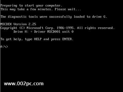 圖8的啟動(dòng)選單中;第一項(xiàng)為∶啟動(dòng)時(shí)加載光驅(qū)驅(qū)動(dòng)程序,第二項(xiàng)為∶啟動(dòng)時(shí)不加載光驅(qū)驅(qū)動(dòng)程序,第三項(xiàng)為∶啟動(dòng)幫助。如果你不選擇,系統(tǒng)在30秒后默認(rèn)啟動(dòng)第一項(xiàng)。用“向下或向上”箭頭選擇鍵選擇第二項(xiàng)“Start conputer without CD-ROM tupport”項(xiàng)即不加載光驅(qū)驅(qū)動(dòng)程序項(xiàng)。然后回車。即可順利啟動(dòng)到純DOS系統(tǒng)。將出現(xiàn)如下圖9的畫面,這時(shí)已完全進(jìn)入。