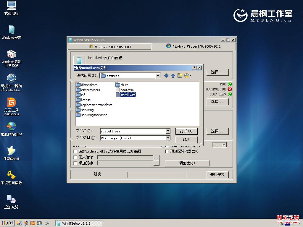 【方法2】通過Win7安裝盤sources目錄下的install.wim利用NT6安裝工具進行安裝。可以自行將win7安裝盤里sources目錄下的install.wim提取到U盤或者硬盤某個分區,然后直接進入PE利用下面的安裝工具來安裝。(32位64位系統通用)