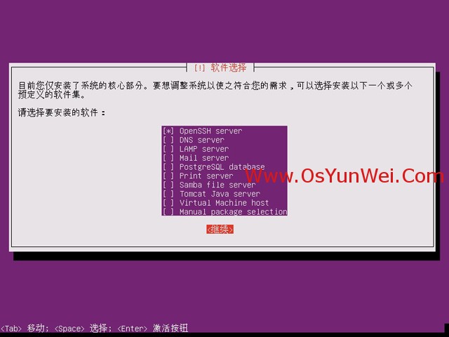 用空格鍵選中OpenSSH server 點繼續(服務器根據自己需求。其它軟件后面再安裝)