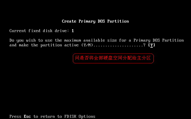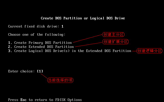 這里有三個選項,各項選項的作用如上圖紅線指示。選第1項(創建主分區)后,按Enter回車鍵后,出現如下圖5所示。
