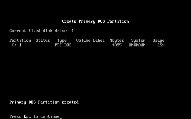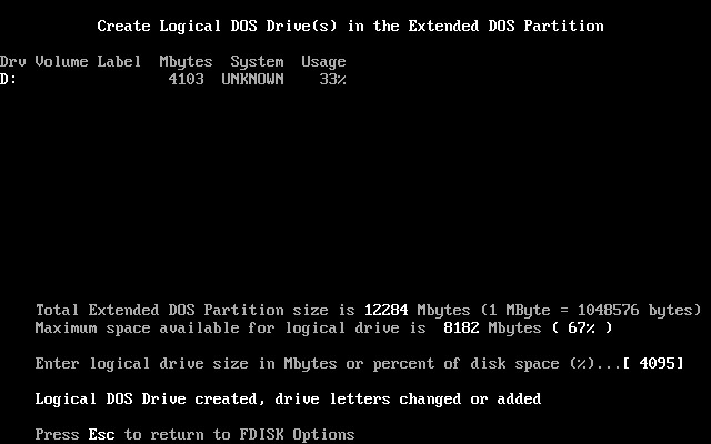上圖中顯示出剛創建的主分區(C盤)的參數∶大小為4095MB。主分區建好了,提示按“Esc”鍵退回主菜單。按Esc鍵后,退回主菜單出現如下圖12所示。