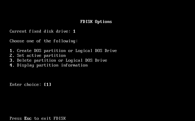 上圖可見,因為沒有可用的硬盤,所以內存占用盤符為C盤,光驅占用盤符為D盤。在提示符“A:/>_”下輸入“fdisk”后按Enter回車鍵打開fdisk程序,出現如下圖2所示。