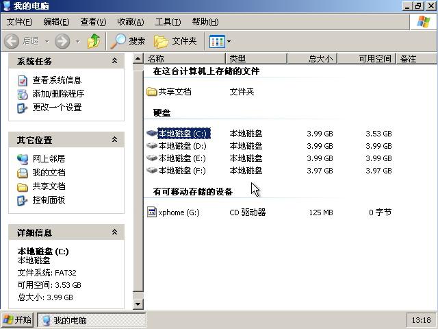 我把各分區格式化為FAT32文件系統后,安裝了XP系統,打開“我的電腦”顯示如下圖36所示。