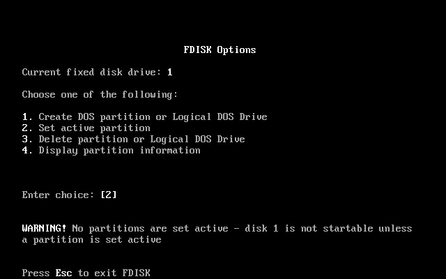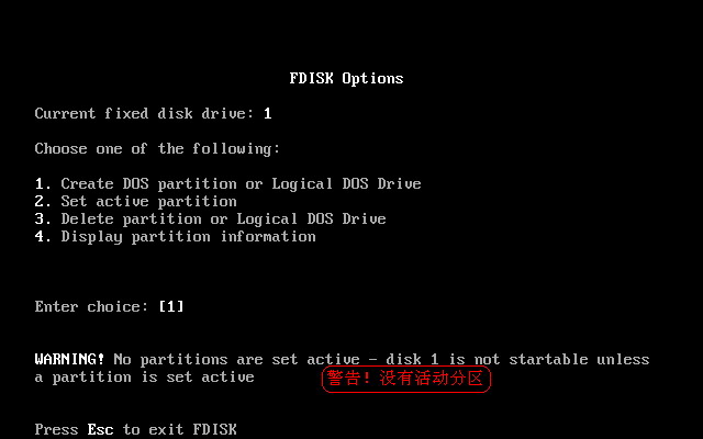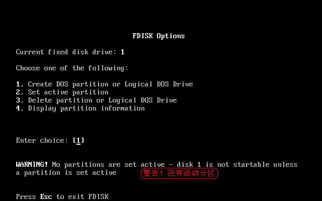 上圖中,“警告!沒有活動分區”。現在應該設置活動分區了。輸入“2”選擇第2項(設置活動分區),如下圖28所示。