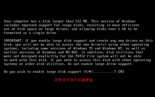 上圖中,問是否支持大硬盤。當然選擇“Y”支持。按Enter回車鍵后,出現如下圖3所示。