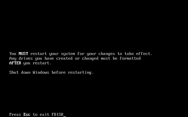 提示要重新啟動系統使設置生效,所有更改的分區在重啟后格式化才能使用。按“Esc”鍵退出fdisk程序,出現如下圖34所示。