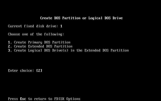 剛才在這畫面選揮了第1項創建了主分區,現在在這里選擇第2項(創建擴展分區),輸入“2”后選擇第2項,如下圖14所示。