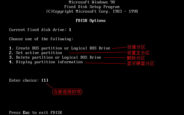 安裝好新買的硬盤或清空了分區表的硬盤后,用98啟動盤啟動系統進入DOS后,出現如下圖1所示。