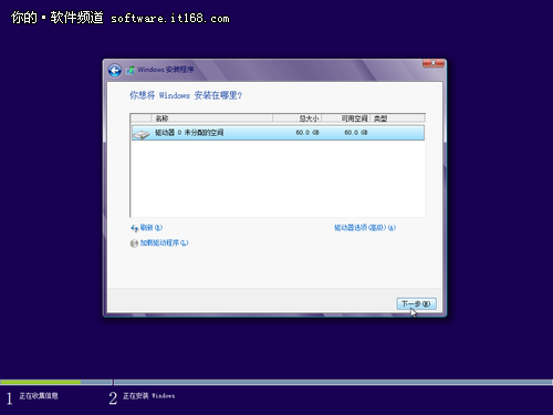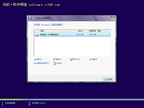 然后就是選擇磁盤,由于我是在虛擬機上安裝Win8系統,所以這里只顯示了一個推薦分配空間,沒有其他分區。也就是說,如果你有多個硬盤,或者是一個硬盤的多個分區,這里的顯示選項會不一樣。但一般的,如果你的電腦里沒有其他系統,并且是第一次安裝Win8系統,那應該安裝到C盤,也就是引導分區;如果是安裝多個分區,一般的,C盤已經安裝了XP或者Win7,那么可以將Win8安裝到D盤、E盤即可。