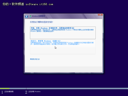下面這張圖,顯示了安裝的方式,升級安裝或者是自定義(全新安裝)。上面我們說了,如果你是現在購買了正版的Win7系統,Win8發布后,你若是再付費98元獲得的序列號,那么這個安裝界面,就選擇升級。