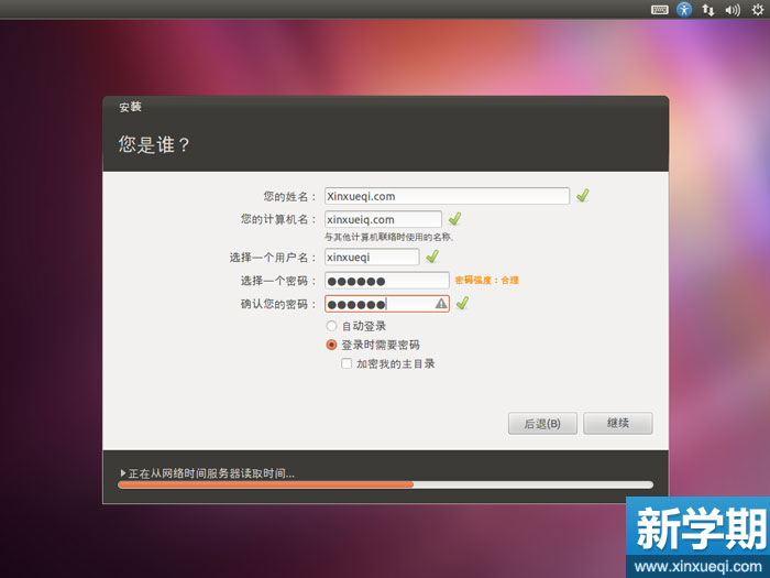 之后會(huì)設(shè)置計(jì)算機(jī)和帳號(hào)信息,這里以“xinxueqi.com”為例,用戶名為“xinxueqi”,密碼為“123456”。設(shè)置完成后單擊“繼續(xù)”,等待安裝過(guò)程結(jié)束。
