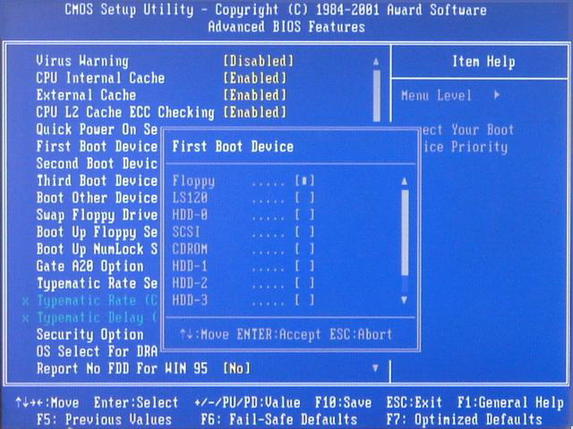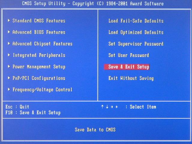(上圖中Floppy--軟盤、HDD-0--硬盤、CDROM--光盤)然后按“向上或向下”箭頭鍵,選擇“Floppy”項,接著按“Enter”回車鍵,即完成該項設置并重新返回了圖4畫面,你可以看到該項設置已經改變了。用同樣的方法設置“Second Boot Device”項為“HDD-0”。設置完成后按“Esc”鍵退出到(圖1)畫面,然后按“向右、向下”鍵選“Save & Exit Setup”項,該項意思(保存設置并退出),如下圖6