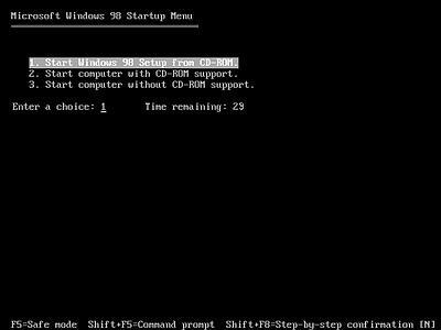 第一項“1. Start Windows 98 Setup from CD-ROM”(從光盤啟動安裝Windows 98系統)
