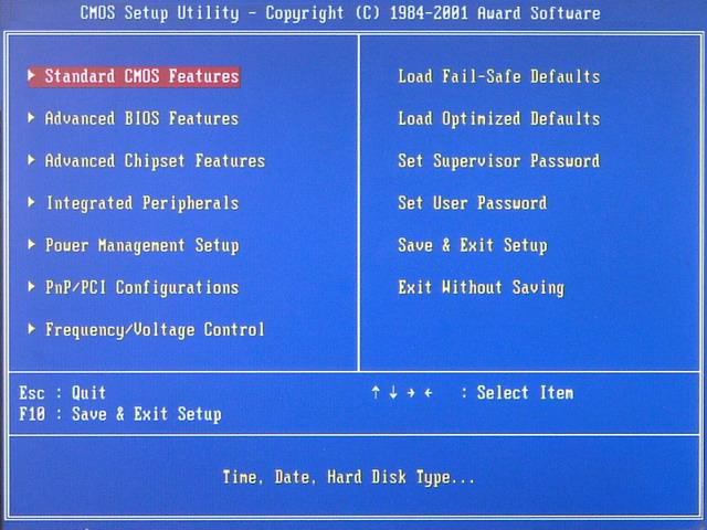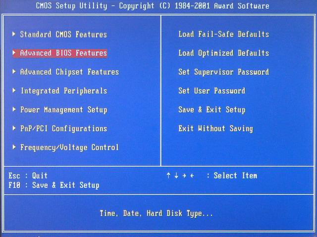 即進入了系統基礎輸入輸出CMOS設置,在這里按“向下或向上”箭頭鍵選擇“Advanced BIOS Features”項。如下圖3