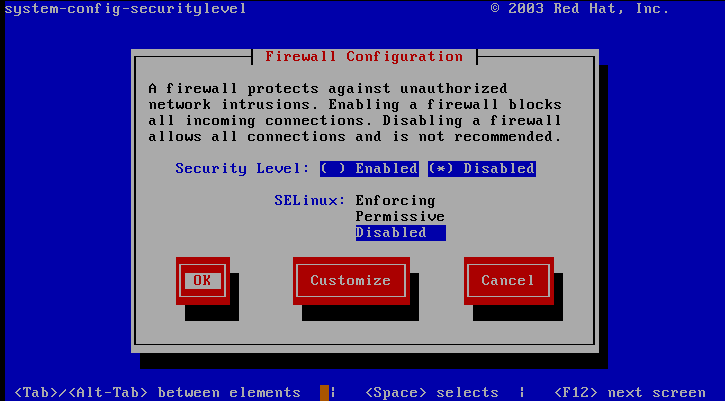 centos5,這個地方進行的改動,不是在安裝的過程設置,而是裝完系統,第一次啟動的時候進行設置。我在這里就把防火墻禁用了。如果這里你不進行設置,進入系統后,可以運行setup命令進行設置,出來的是同樣的界面。禁用selinux的防火墻,你還可以通過修改配置文件