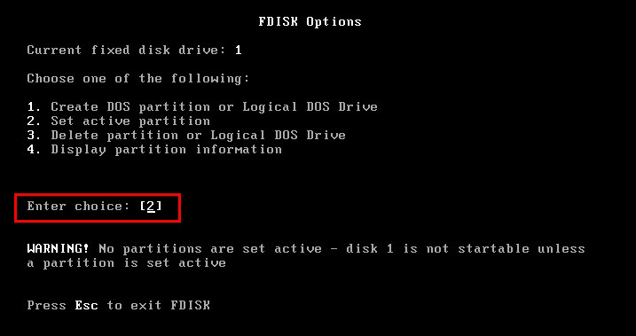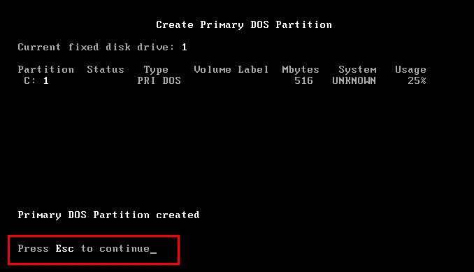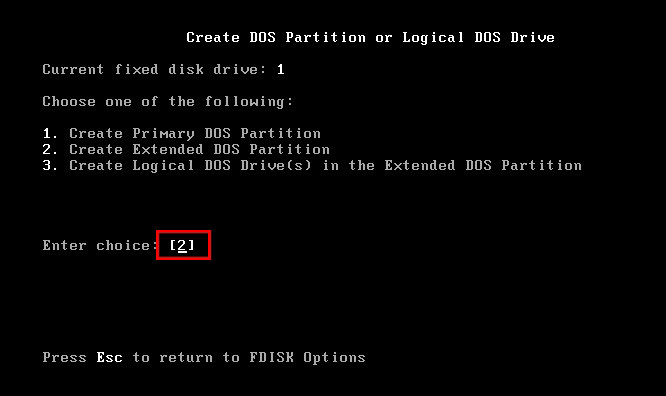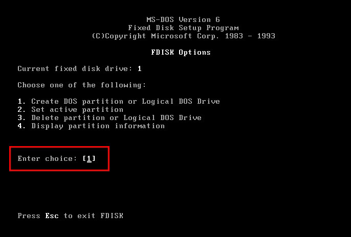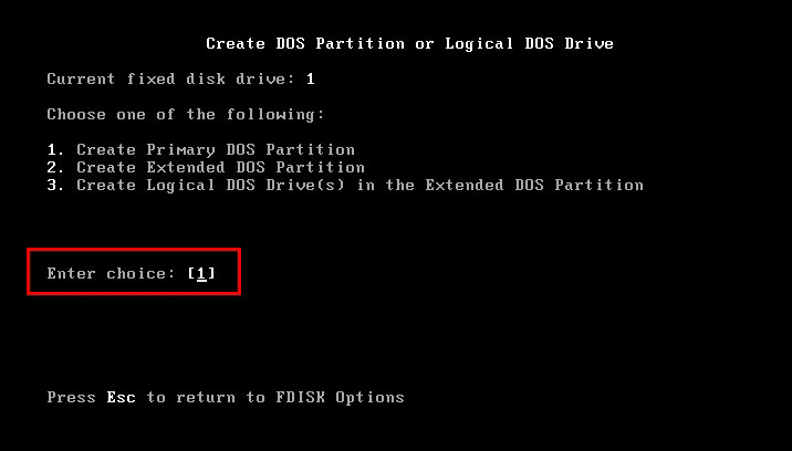 使用過fdisk的讀者對這個傳統的fdisk界面應該不陌生。選擇1,建立DOS分區。