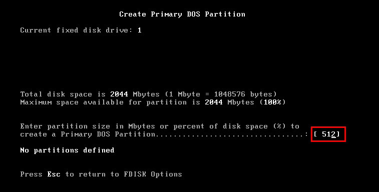 (4)在DOS提示符下輸入fdisk給虛擬硬盤分區